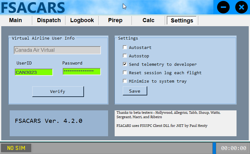 4. Go to the Settings tab and enter your Canada Air Virtual pilot ID and password